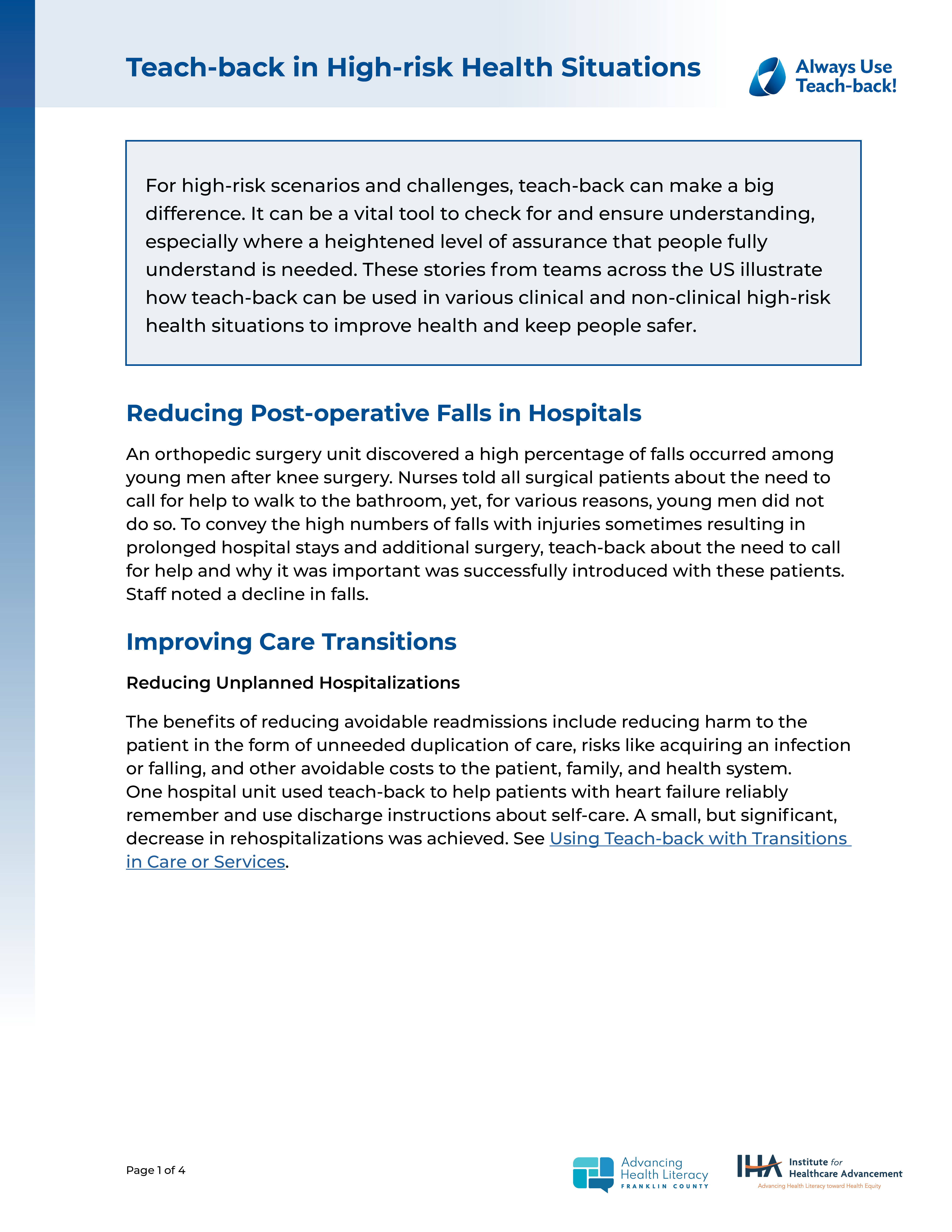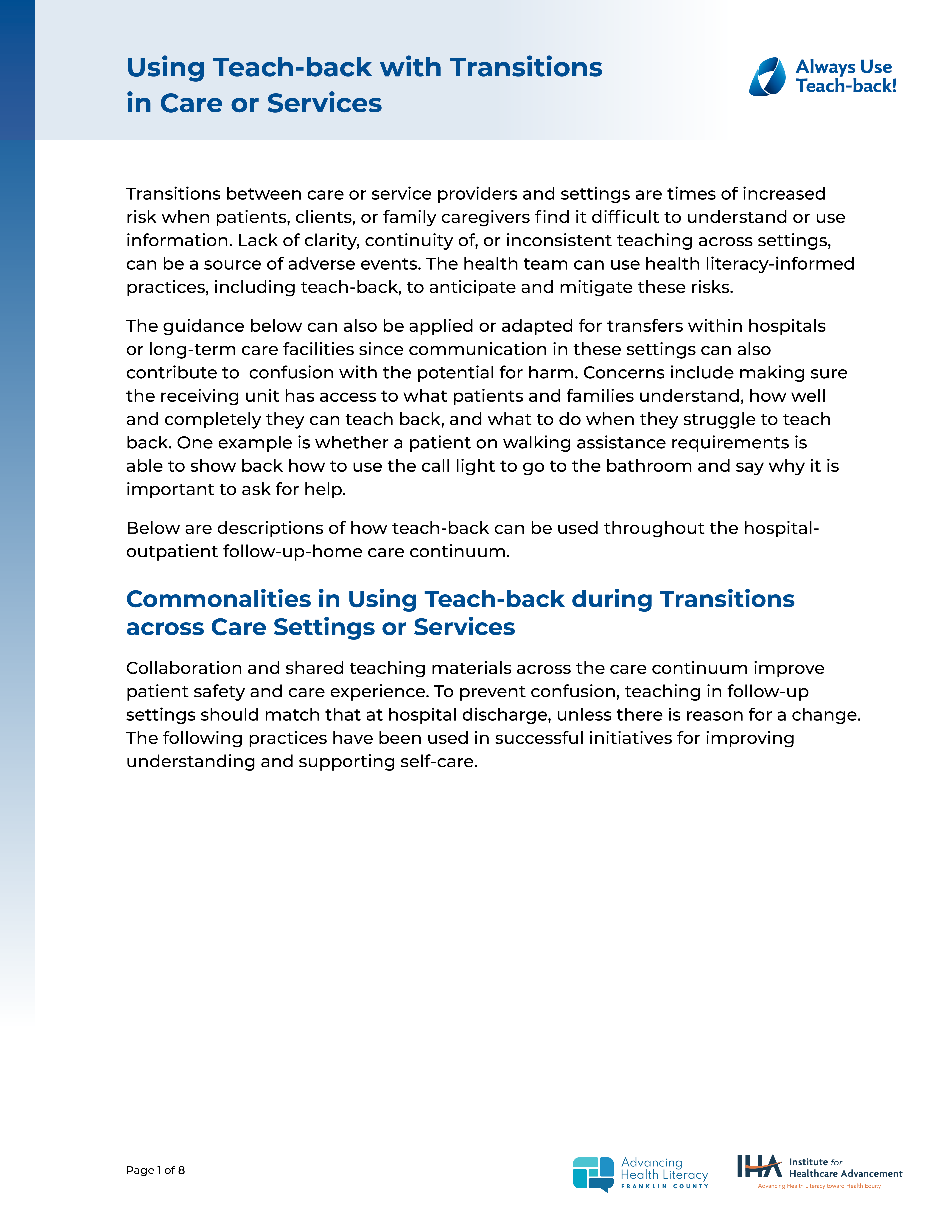 • Use teach-back with transitions between providers or settings of care or services when people are at increased risk for harm. Click here to download.
